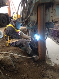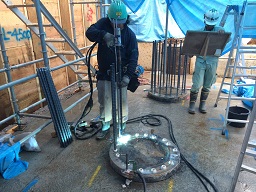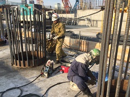 建築現場での「基礎工事」における、シートパイル溶接・切断、鋼管杭溶接・切断、H鋼切断、杭回転埋設金物(ヨーカン)切断、杭頭補強筋の溶接、アンカー取付、スタッド溶接などを行います。また「仮設工事」における、敷き鉄板溶接なども行います。